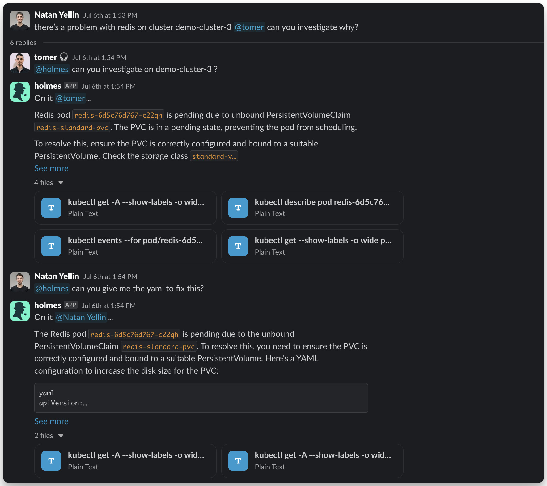 First install Robusta SaaS, then tag HolmesGPT in any Slack message for instant analysis.