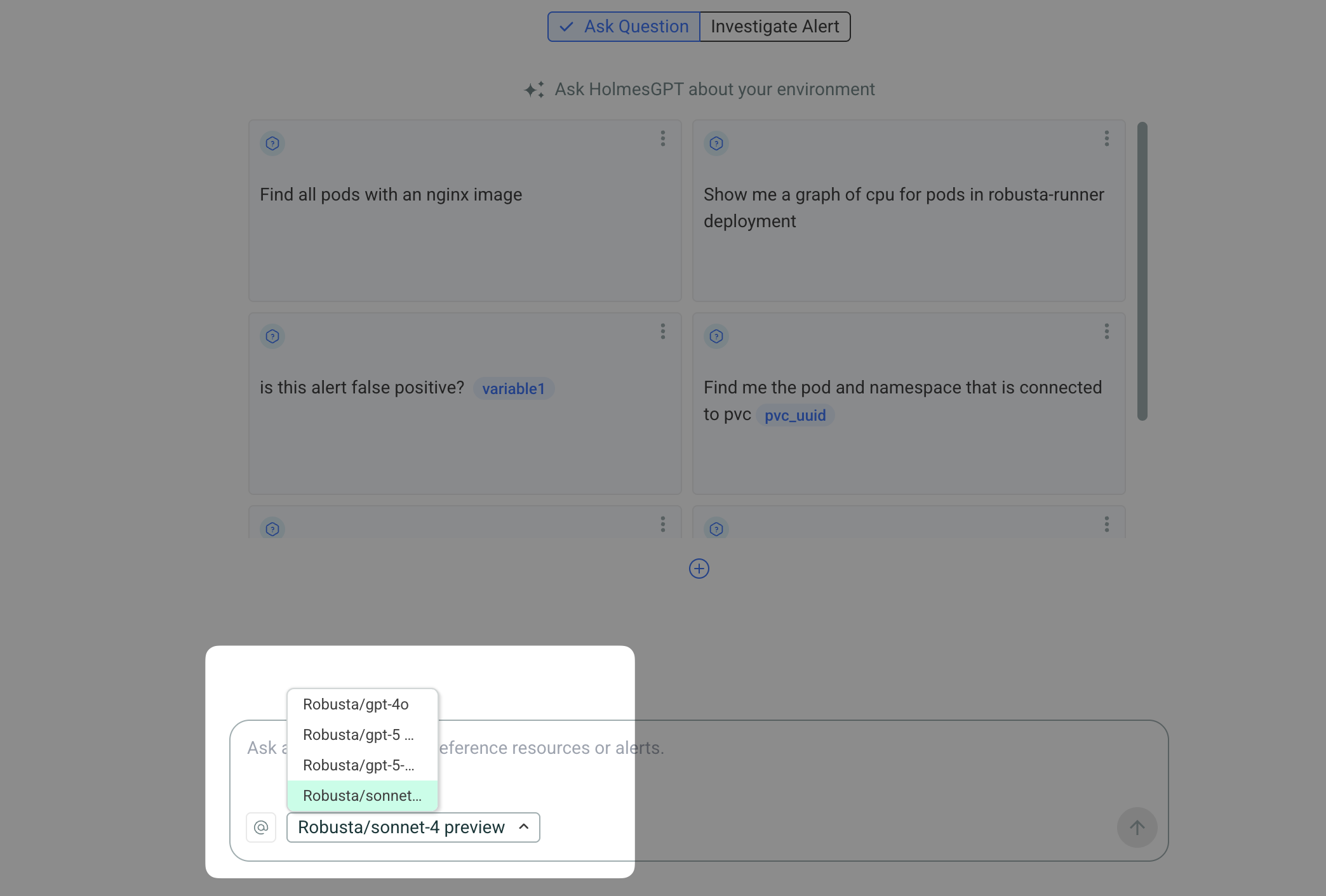 When Robusta AI is enabled, models appear in the model selector dropdown in the Robusta UI. Users can select any available model for their investigations.